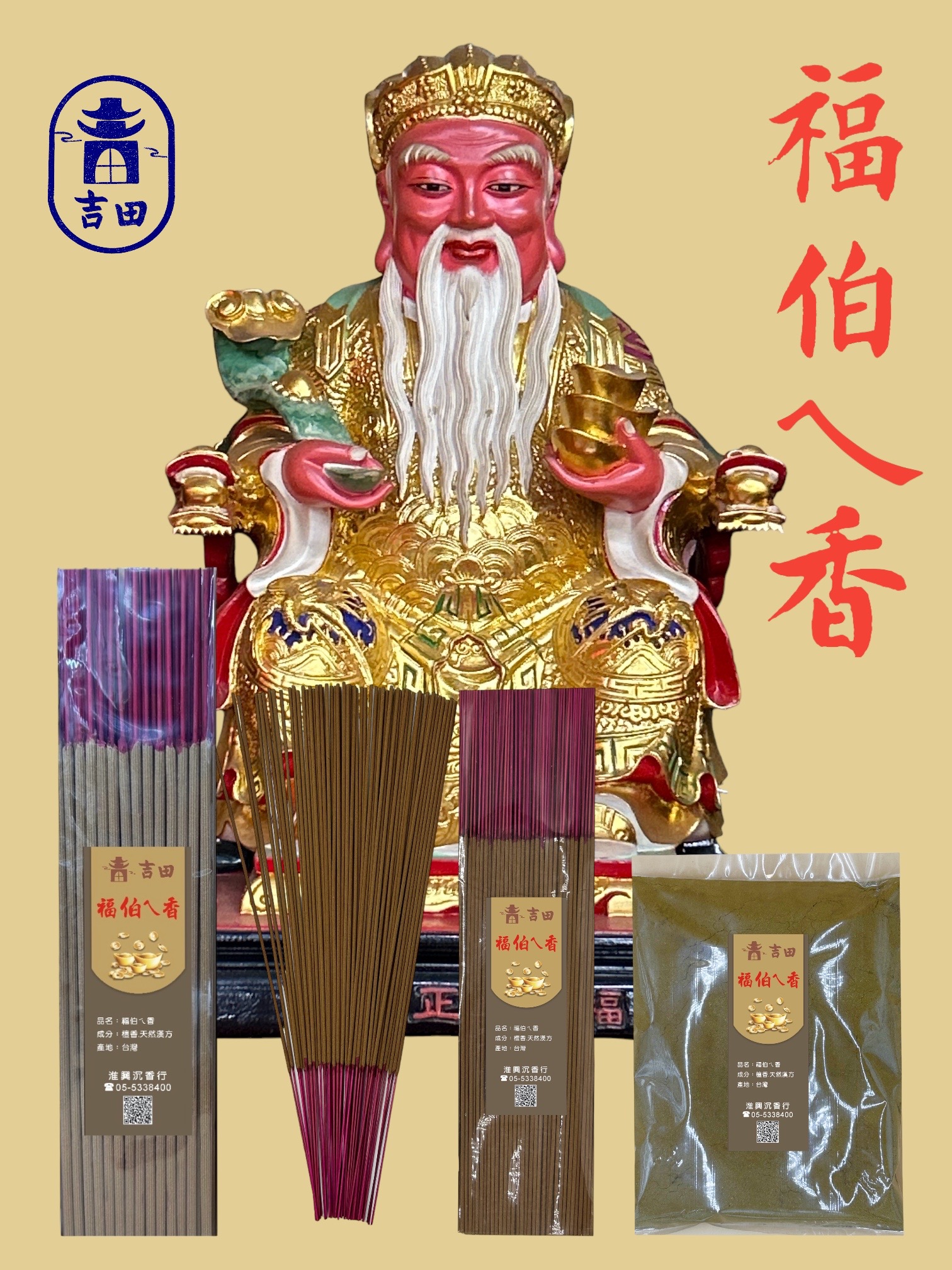 「吉田『福伯ㄟ香』,不僅是供奉福德正神的特別香,更是福德正神慈悲為民、特別調配的福氣神香。無論您是在家中祈福、供奉神明,抑或是平日希望居家香氣撲鼻,都適合使用。